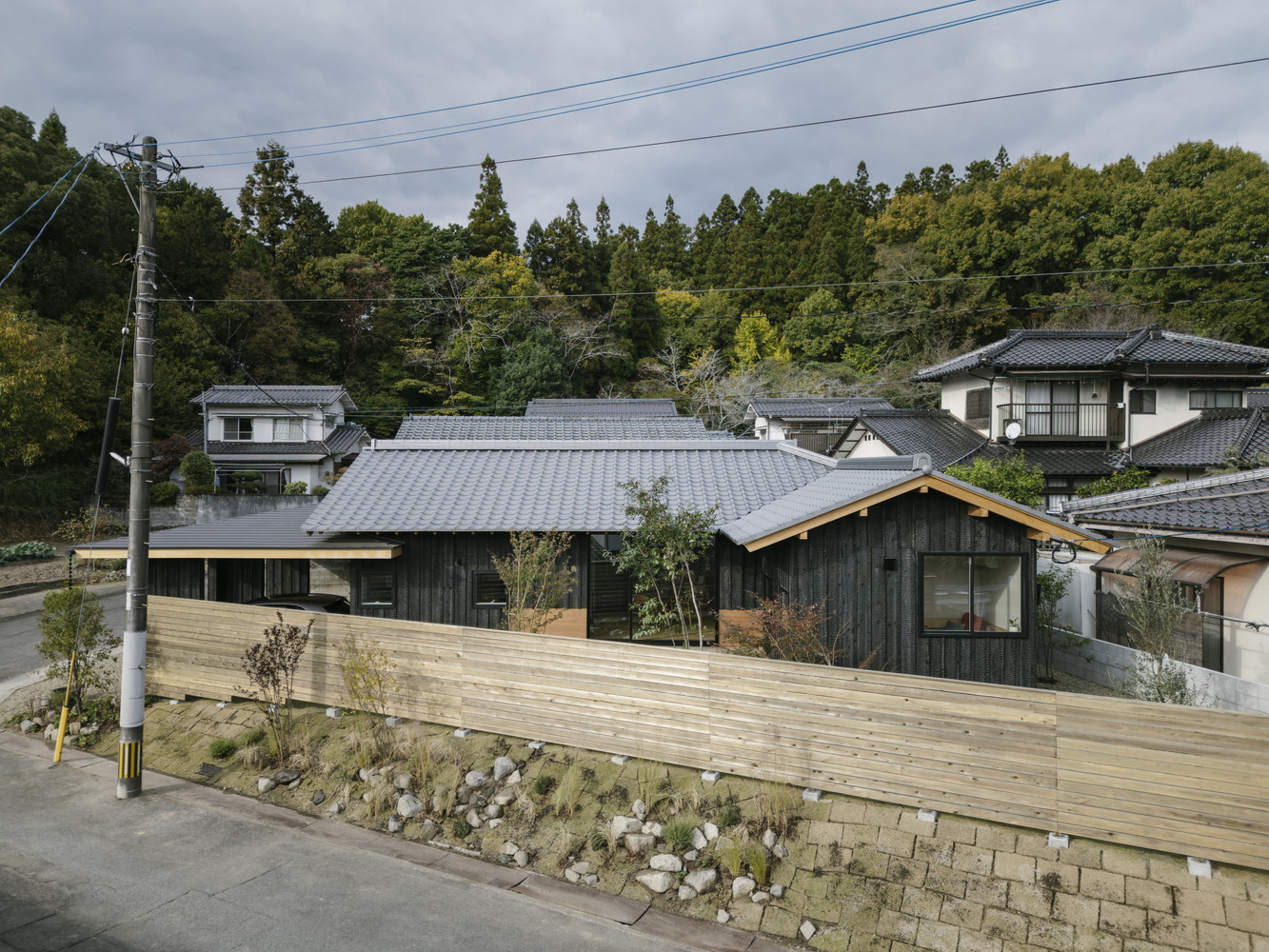 大分県別府市の桜の木が並ぶ坂道の閑静な住宅街に建つ車寄せのある薩摩焼杉の平屋になります。