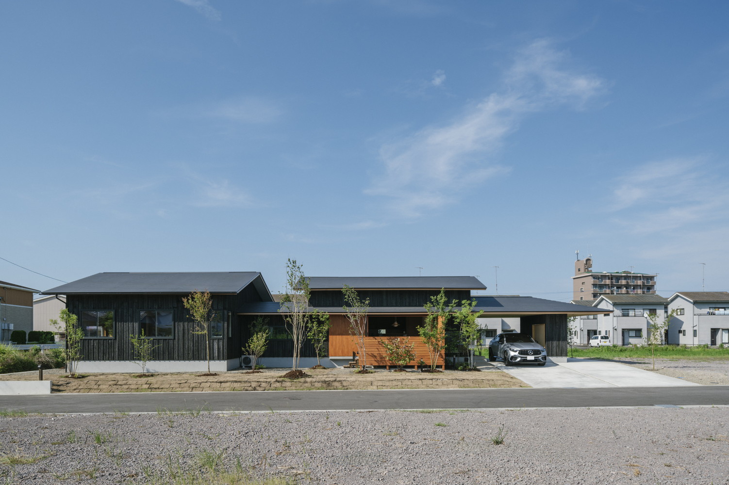 杵築ICからすぐのところにIターンの苺農家さんが営むビニールハウスがあります。その一角に建つ薩摩焼杉のシンプルな平屋になります。