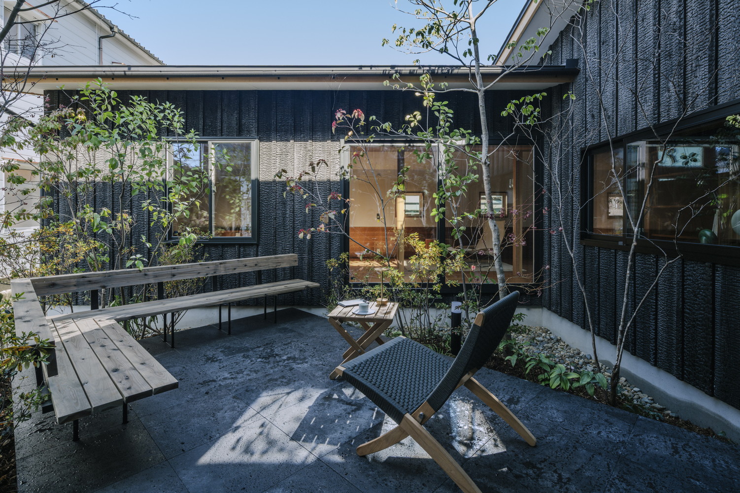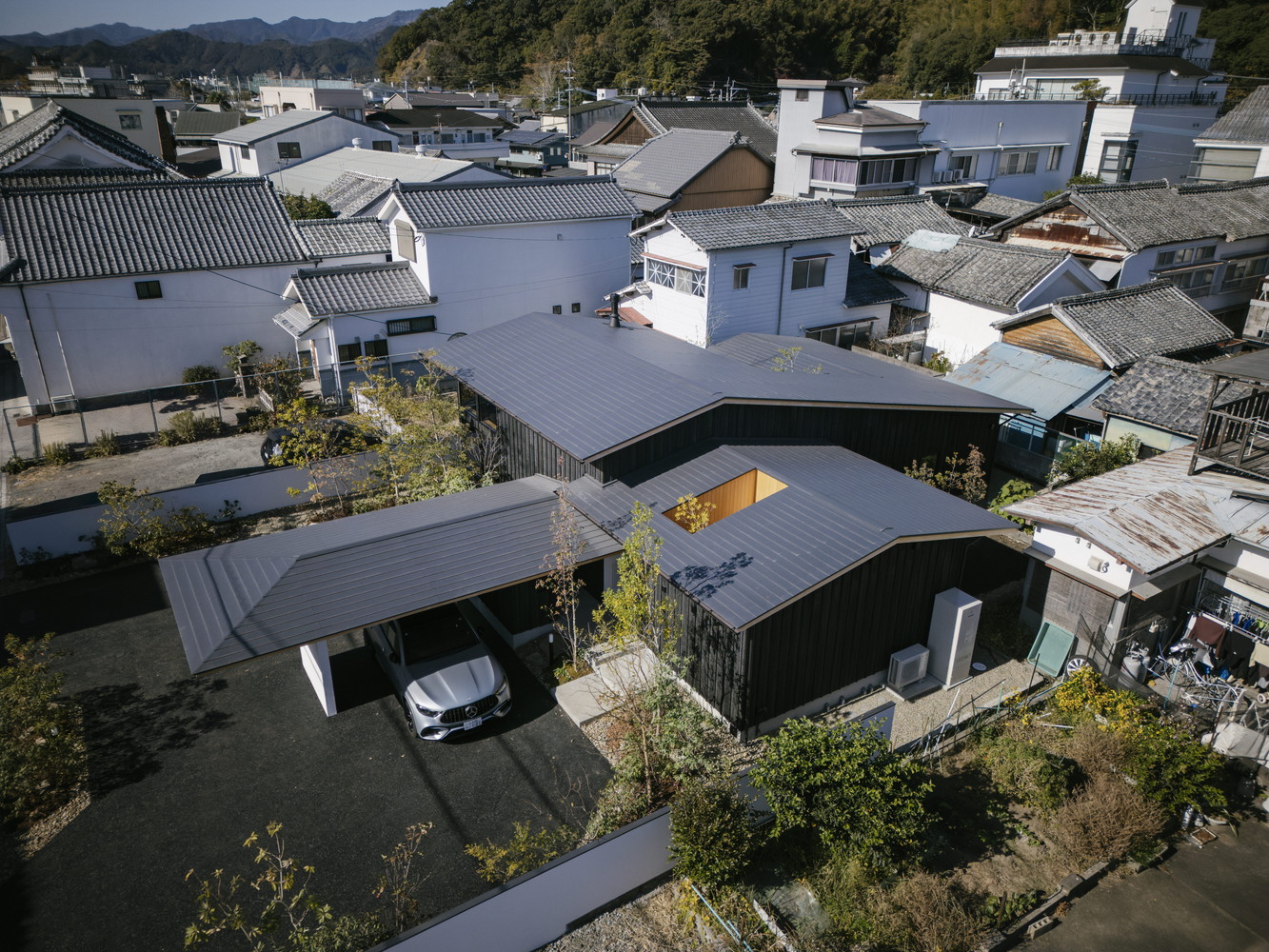 大分県佐伯市船頭町の古い建物が建ち並ぶ土地に建つ、平家の焼杉のコの字型の家になります。