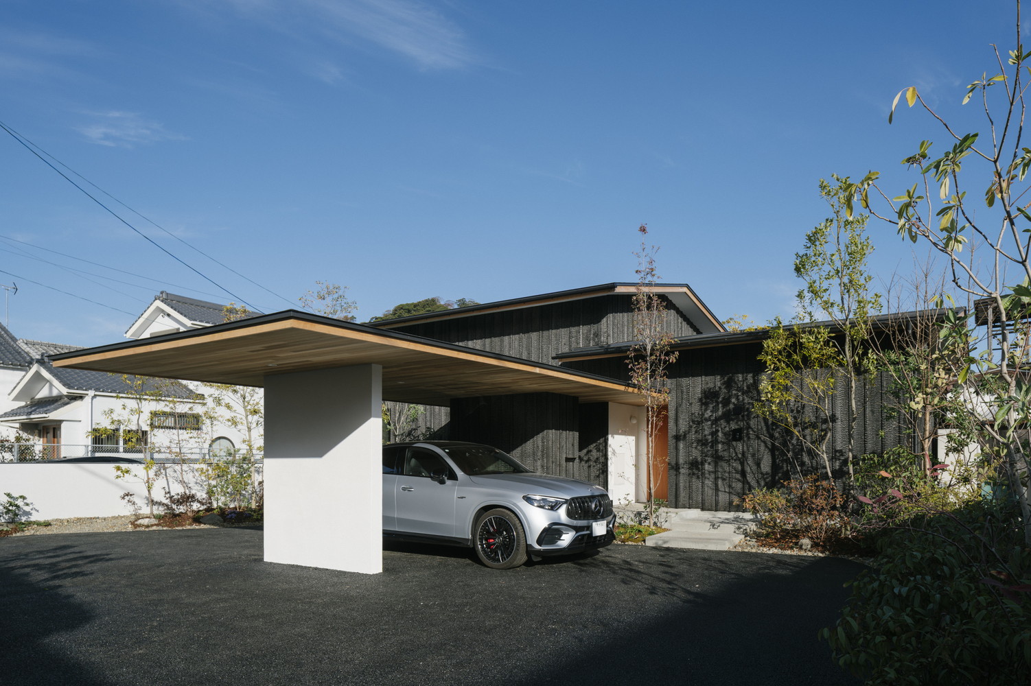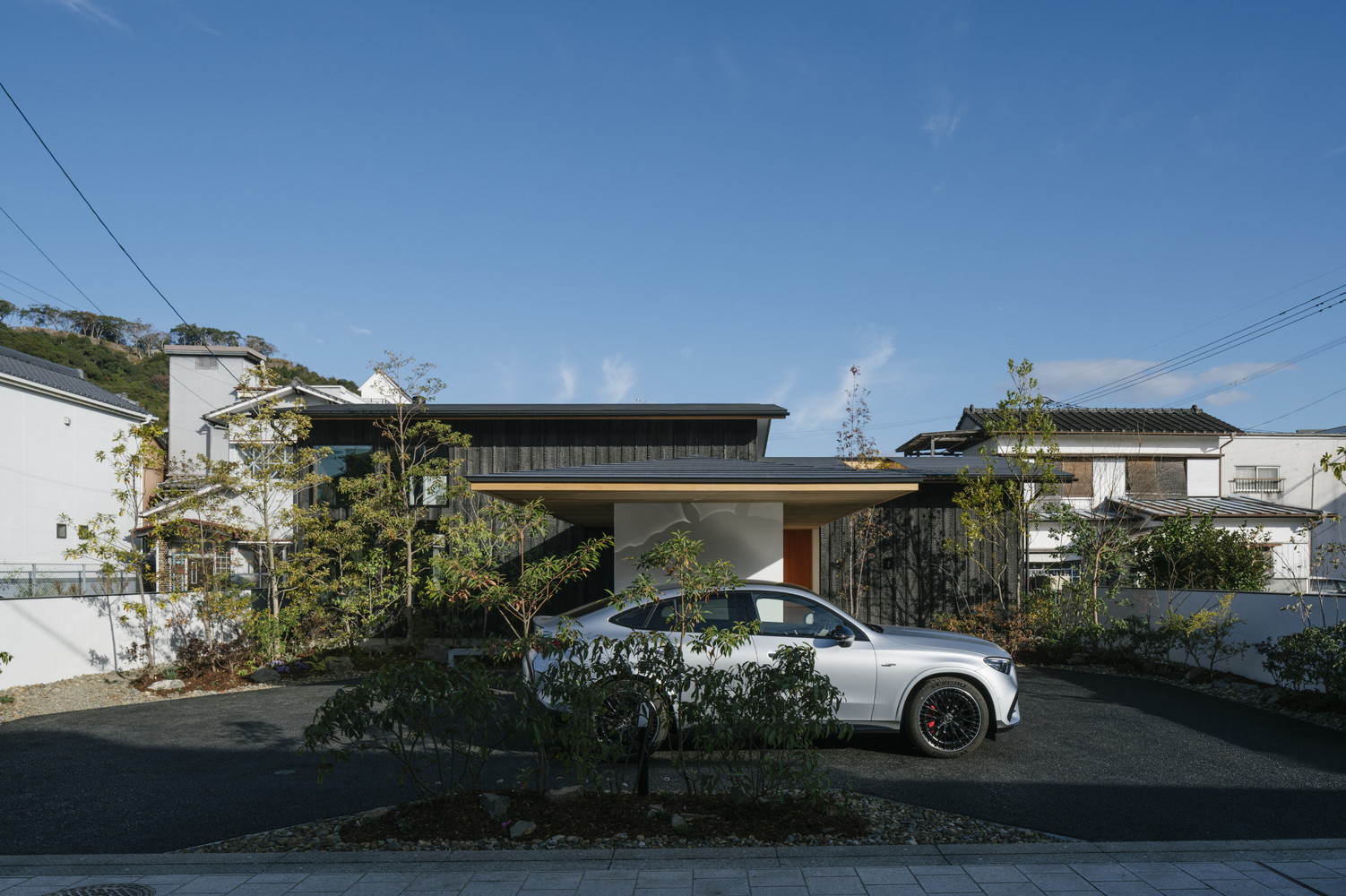 車は前進で入り前進で出る、ホテルや旅館のような寄棟の屋根の車寄せとなっています。道路から見た外観は中央に高さを抑えた寄棟の屋根、ガレージの奥に中2階くらいの高さの薩摩焼杉の外壁。そこに、たくさんの緑が散りばめられています。