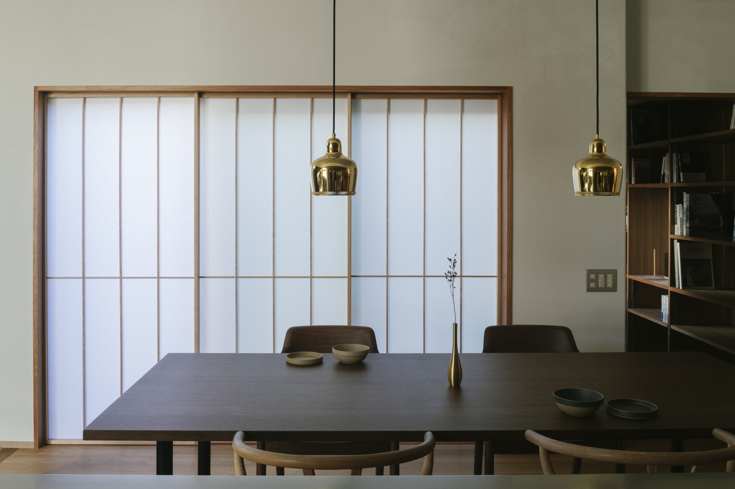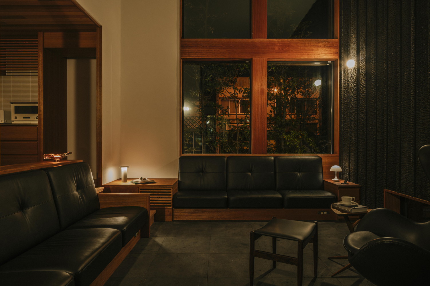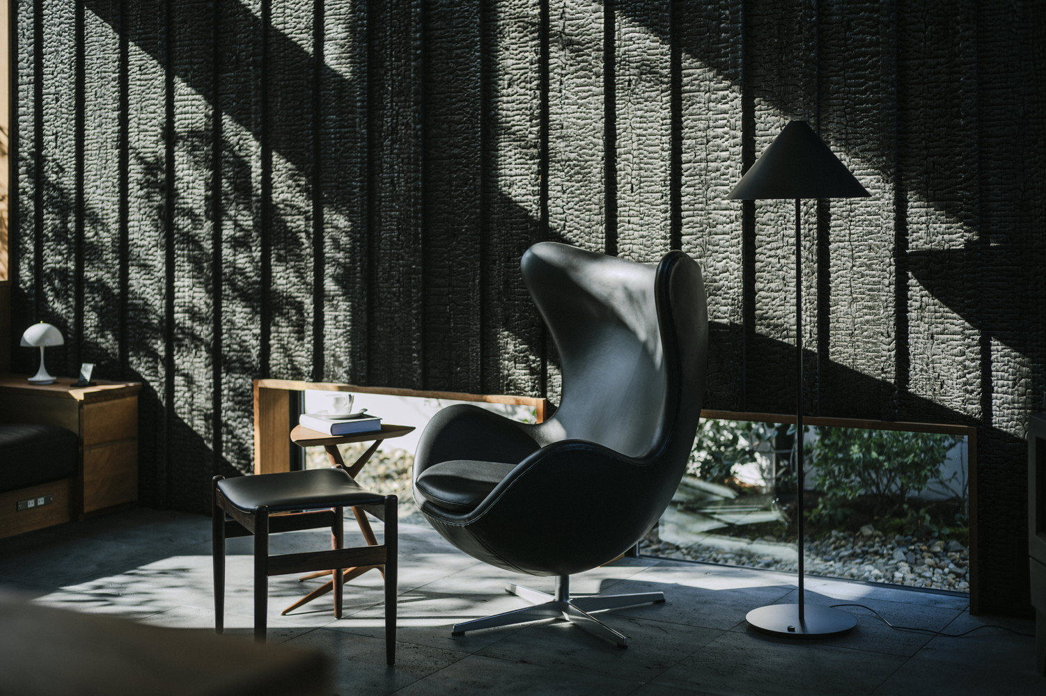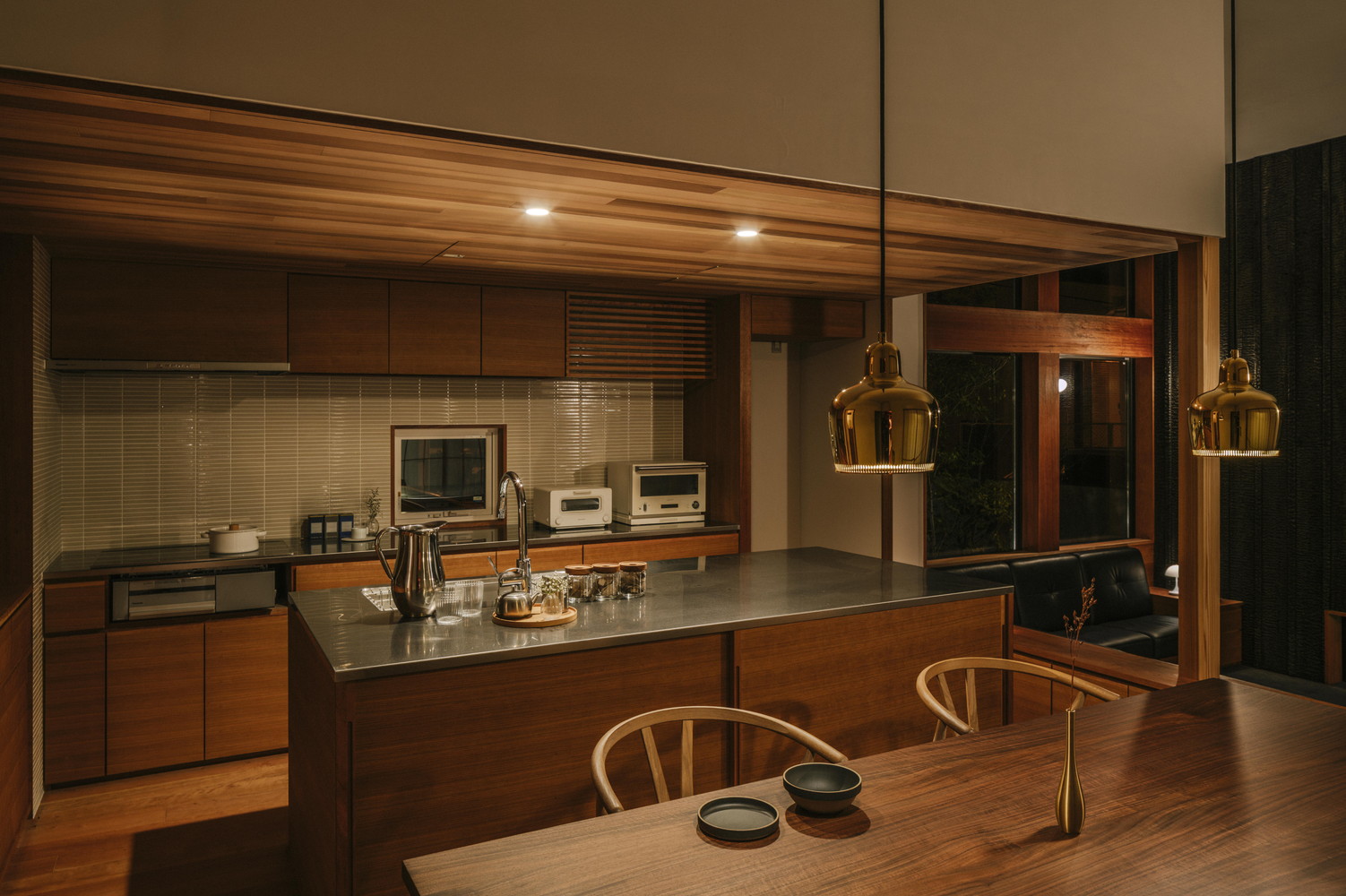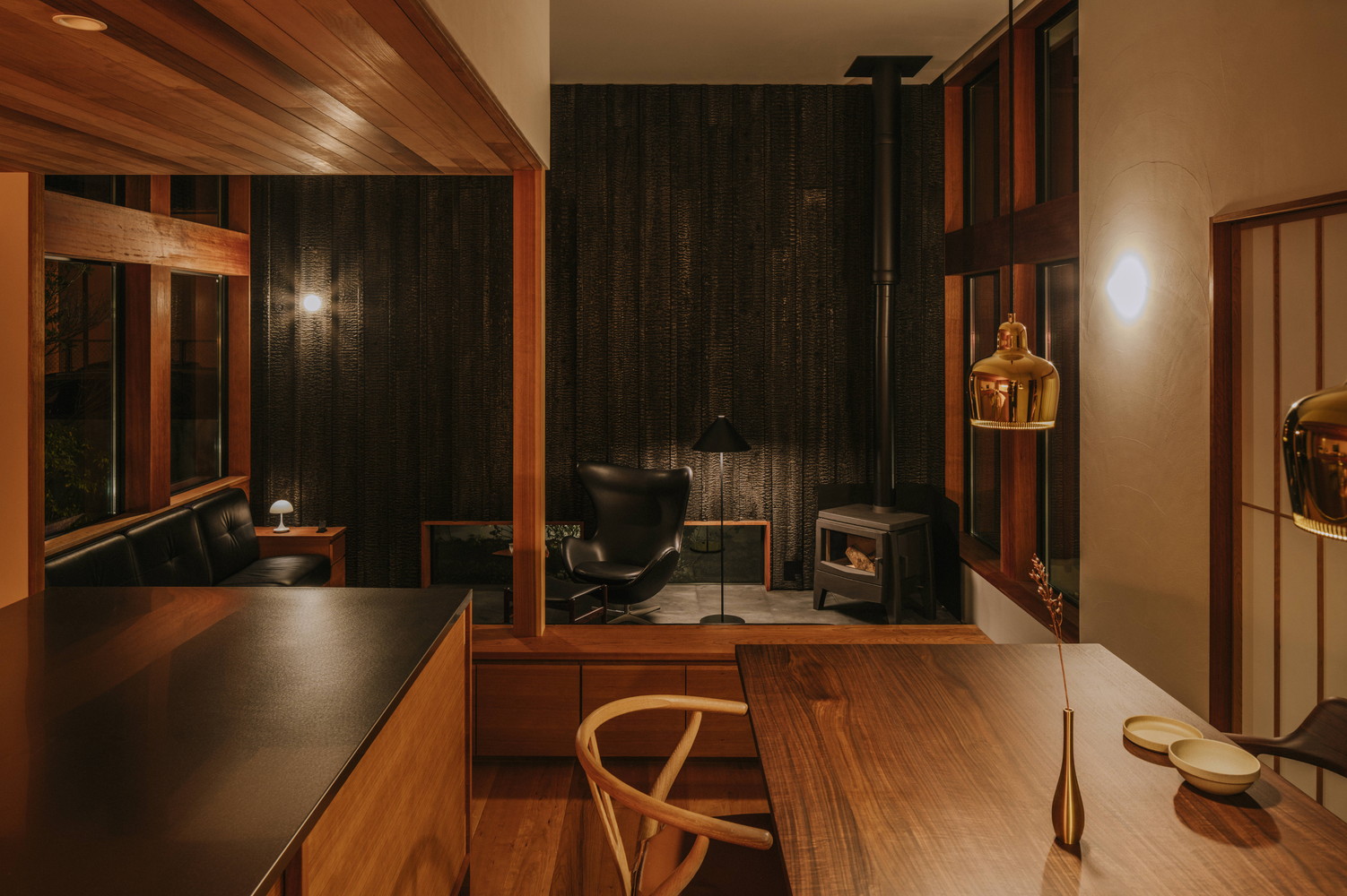 リビングとダイニングは、天井高さ3300の高天井となっていて、リビングは更に450下り、3750の高い天井。この段下りのリビングは中庭の石土間と同じ石が張られ、その正面の壁は焼杉が外壁から連続して室内に伸び、天井いっぱいの2面のガラスからは、庭に植えられた高木の緑とつながり、森の中にいるようなリビングとなっています。